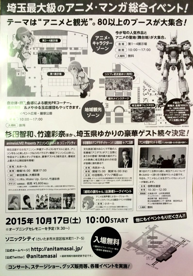 2015年09月23日 第3回アニ玉祭(アニメ・マンガまつりin埼玉) 10月17日大宮ソニックシティで開催 10月17日に大宮のソニックシティで10時より、「第3回アニ玉祭(アニメ・マンガまつりin埼玉)」が開催されます(入場無料)。 埼玉最大級のアニメ・マンガ総合イベントだそうです。 このポスターのキャラクターは「サクヤ」ちゃん。埼玉県アニメ応援キャラクターだそうです。 以前、仕事で移動している途中、熊谷駅で「埼玉、行こ。」というポスターを見かけ、このキャラ誰だっけ?と思っていたのですが、わかりました。 10月18日は戸田市の市民体育祭前日ですが、ご関心のある方は要チェックです。 「埼玉県」カテゴリの最新記事 < 前の記事次の記事 > コメント コメントフォーム 名前 コメント 評価する リセット リセット 顔 星 投稿する 情報を記憶 トラックバック