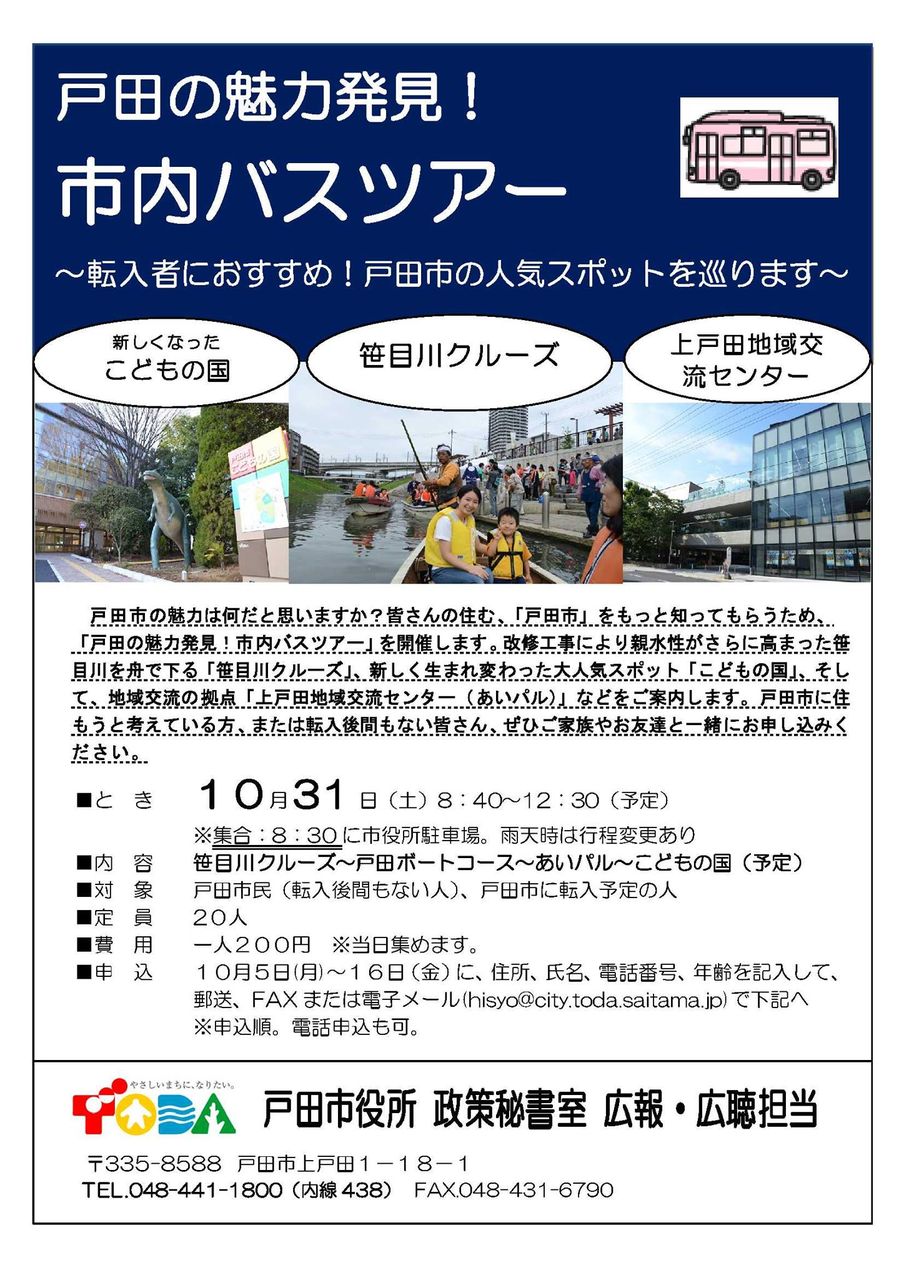 2015年10月07日 戸田市の魅力発見!バスツアーが今年も開催されます 毎年大人気・大好評の企画、今年も開催されます。戸田の魅力発見!市内バスツアーです。今年は戸田ボートコースを除き昨年までとコースが一新されました。面白そうですね。対象は戸田市民(転入後まもない人)・戸田市に転入予定の人ということですが、ご関心のある方は直ぐにでも申し込まれることをおすすめします。すぐに定員に達してしまいます。 「戸田市」カテゴリの最新記事 < 前の記事次の記事 > コメント コメントフォーム 名前 コメント 評価する リセット リセット 顔 星 投稿する 情報を記憶 トラックバック