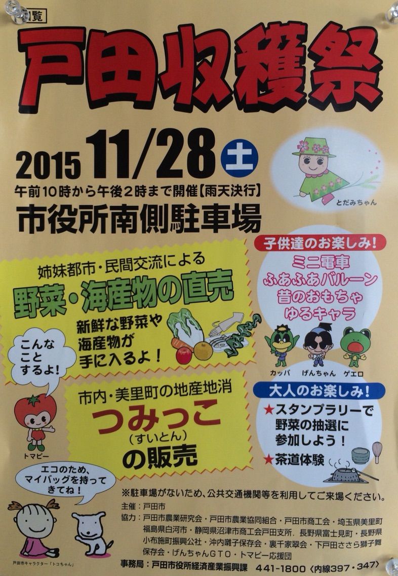 2015年11月27日 「戸田収穫祭」明日開催 戸田市役所南側駐車場を会場に! 明日は「戸田収穫祭」が開催されます。午前10時から午後2時まで。かつての農業祭。戸田市内で収穫された農作物を中心に、友好姉妹都市の物産も販売されます。明日は天候良さそうです。毎年この日は天候に恵まれているような記憶があります。物産販売だけでなく、上戸田ゆめまつりでもおなじみの「ふわふわバルーン」や「ミニ電車」コーナーもありますよ。ベーゴマなどの昔の遊びができるコーナーも。茶道体験や下戸田ささら獅子舞の演舞などもあります。エコバックもって、ぜひ会場に足をお運びください。 「戸田市」カテゴリの最新記事 < 前の記事次の記事 > コメント コメントフォーム 名前 コメント 評価する リセット リセット 顔 星 投稿する 情報を記憶 トラックバック