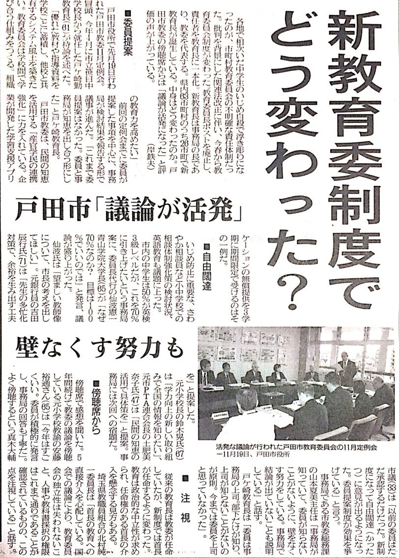 昨日の埼玉新聞に「新教育制度でどう変わった? 戸田市『議論が活発』 壁なくす努力も」という見出し記事が掲載されました。