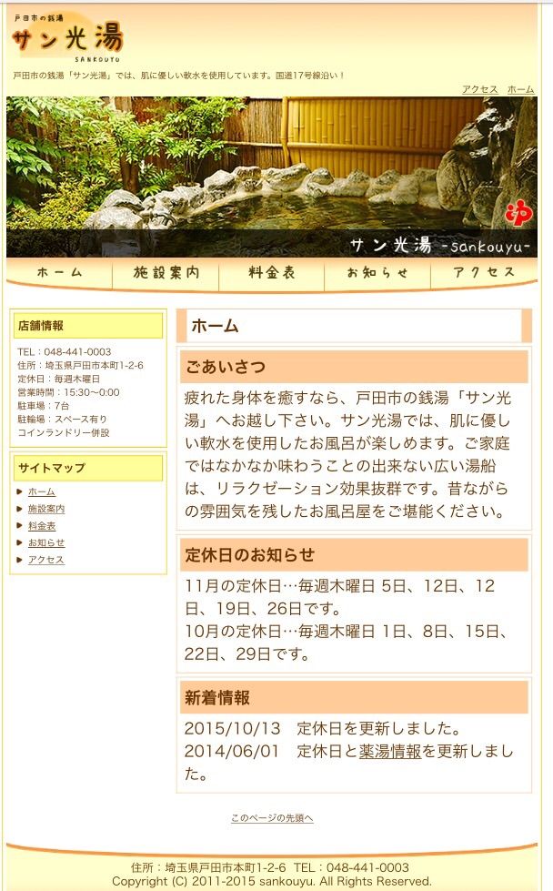 2015年12月22日 今日は冬至 戸田市内の銭湯では柚子湯かも 本日は冬至。 毎年冬至には、私は銭湯に行くことにしています。 よく行くのは、国道17号の本町交差点東南角近くのサン光湯さん。毎年、冬至には柚子湯が提供されます。 露天風呂あり、ミストサウナあり、薬湯あり、水も軟水でなかなか気に入っています。 遅くまでやっていますよ。おすすめです。 http://sankouyu.com/index.html 「お店」カテゴリの最新記事 < 前の記事次の記事 > コメント コメントフォーム 名前 コメント 評価する リセット リセット 顔 星 投稿する 情報を記憶 トラックバック