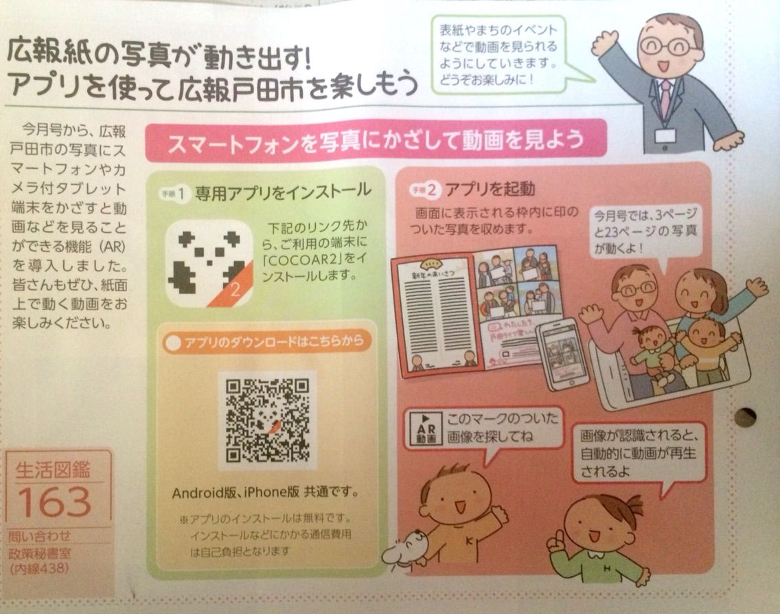 広報戸田市1月1日号の裏表紙に書かれた説明をもとに専用アプリCOCOAR2をスマホにダウンロードしてインストール。そしてARが埋め込まれた写真にかざしてみました。