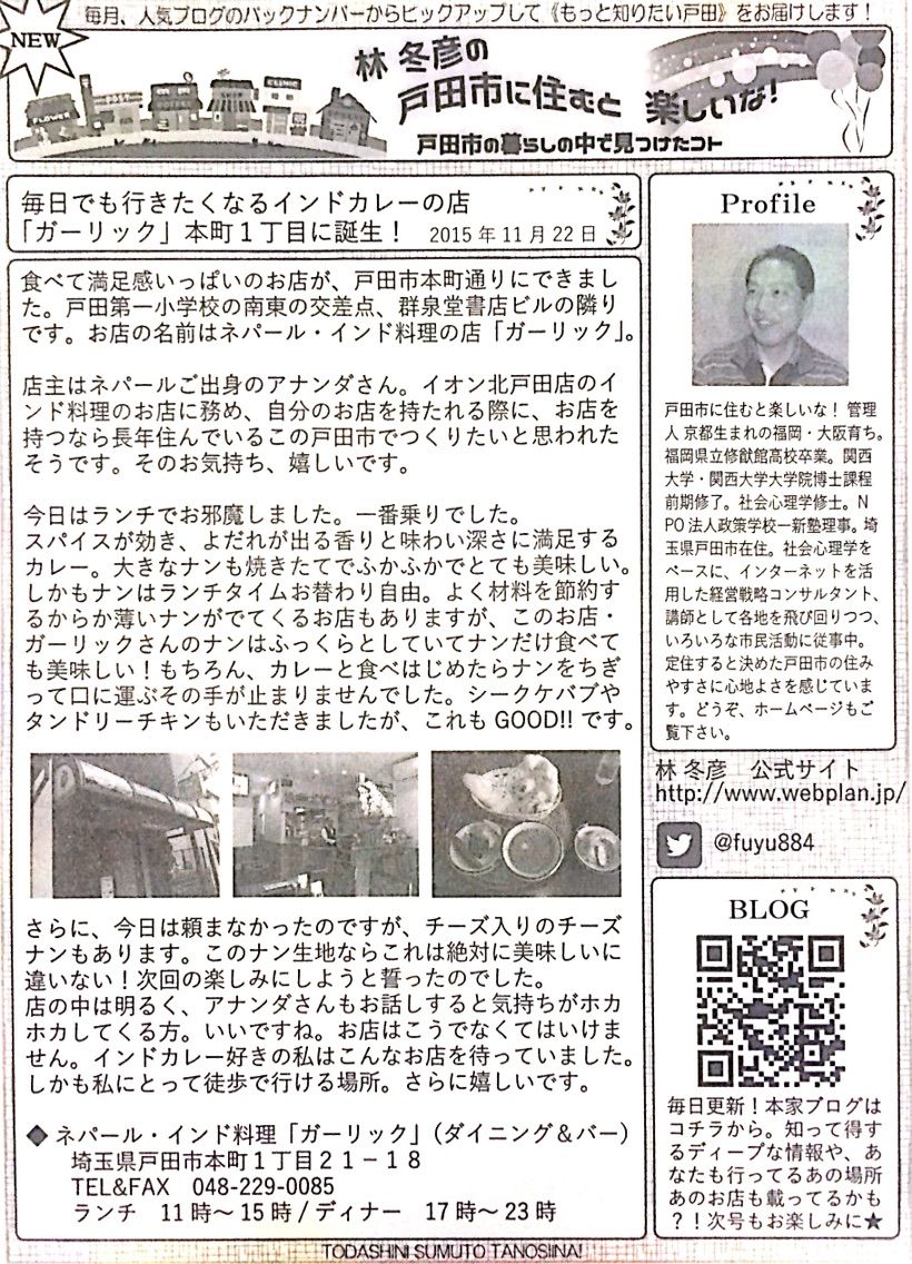 第一回目は、昨年12月に戸田第一小学校南東の本町通りに面した場所にオープンしたインド料理のガーリックさんをご紹介した記事です。