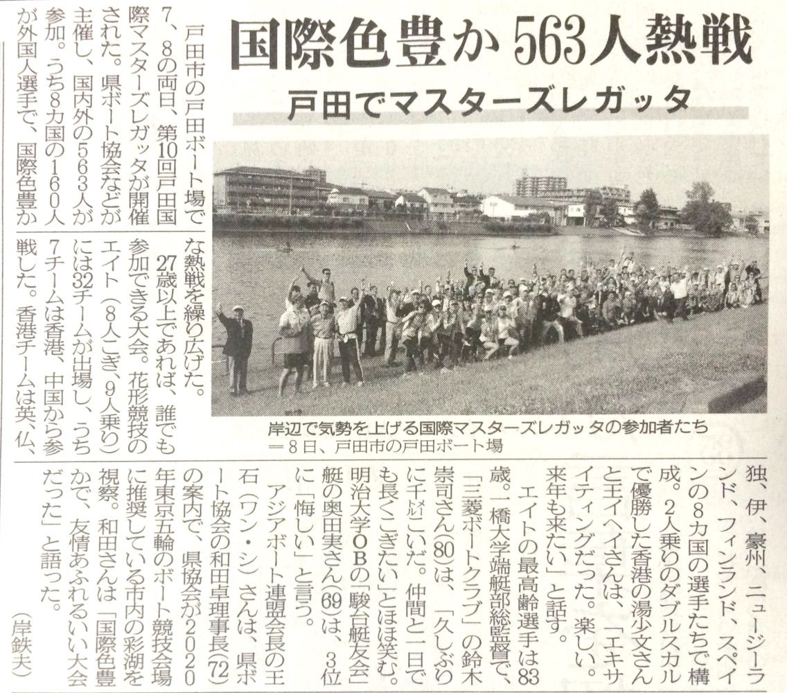 この戸田ボートコースで、先週の土日「国際マスターズレガッタ」が開催されましたが、それが本日の埼玉新聞に記事掲載されていました。