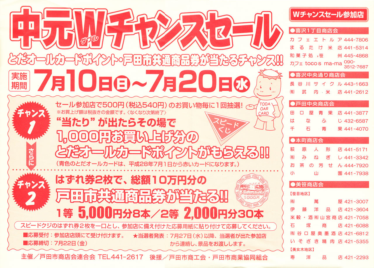 参加店で買物をするとポイントがたまる「とだオールカード」の中元Wチャンスセールが開催中です。