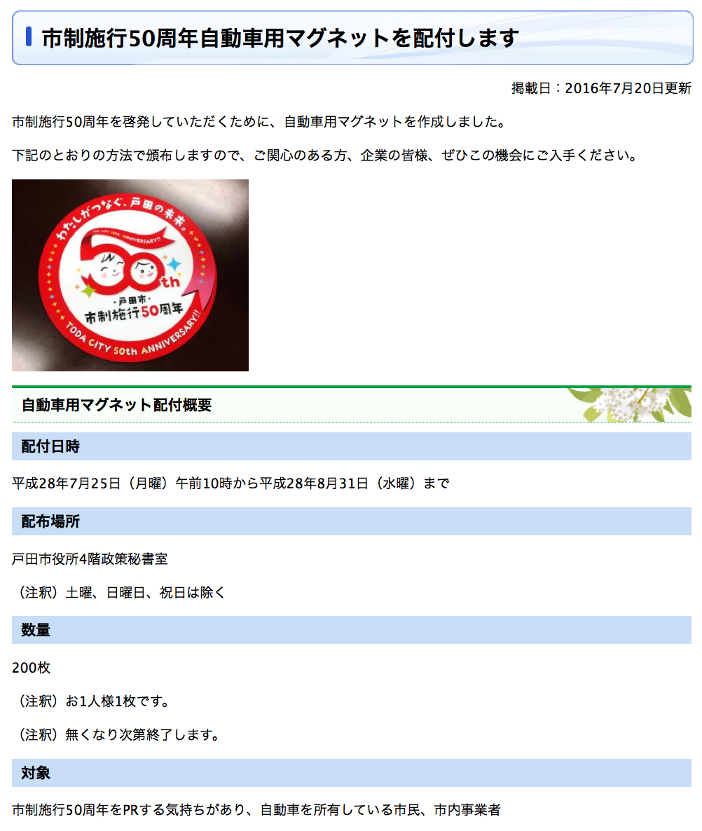 また、この市制施行50周年であることを戸田市民の方々に広く知ってもらおうと啓発グッズを作成し、機会を設けては配布していますが、来週の月曜日に「自動車用マグネット」が配布されることになりました。