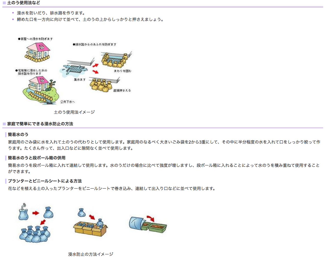 さて、その土のうを具体的にどのように水防に役立てるかについて、東京都・目黒区のホームページに図解されていましたので、ご紹介します。