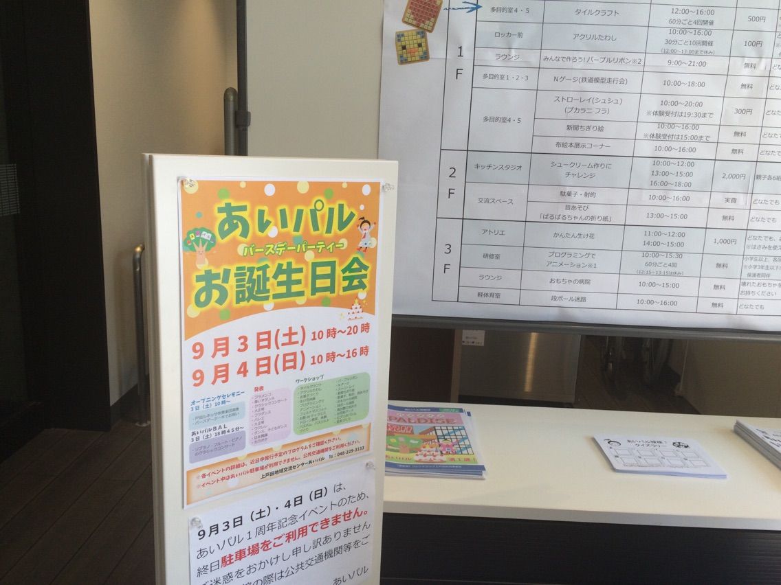 今日と明日、戸田市の本町通り、戸田市立上戸田地域交流センター・あいパルで設立1周年をお祝いするお誕生日会イベントが開催されていて、今私は会場に来ています。