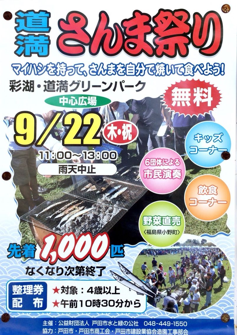 2016年09月06日 戸田市道満さんま祭り 9月22日彩湖道満グリーンパークで開催 〈戸田市にお住いの皆様へ〉 まだまだ残暑厳しい日が続いていますが、9月といえば暦の上では秋なんですよね。 秋の味覚といえば、さんま。そのさんま祭りが今年も彩湖・道満グリーンパークで開催されます。 先着1000名様。無料です。 毎年人気のイベント。9月22日祝日のオススメです! <追記>9月21日に戸田市より会場コンディション不良のため中止が発表されました。 「イベント」カテゴリの最新記事 < 前の記事次の記事 > コメント コメントフォーム 名前 コメント 評価する リセット リセット 顔 星 投稿する 情報を記憶 トラックバック