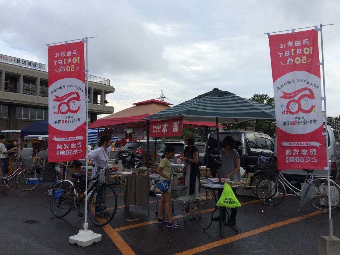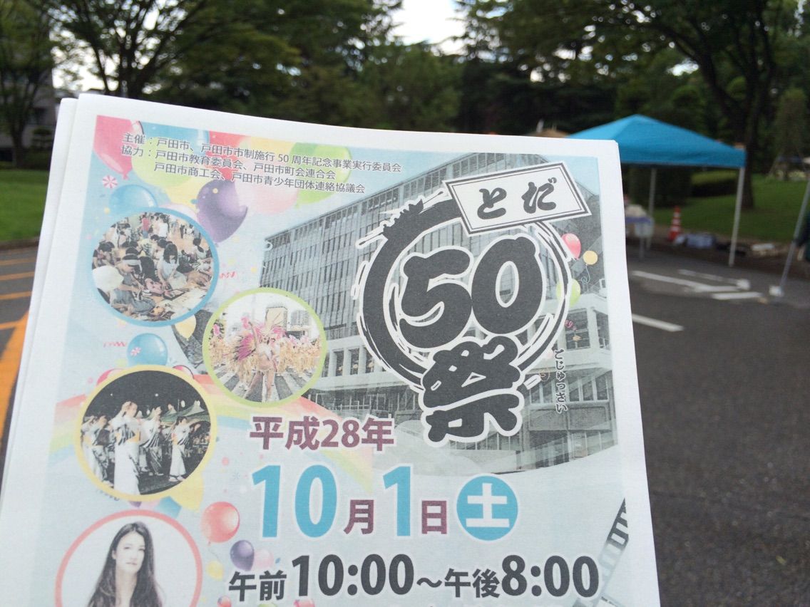 私は本部テント近くで10月1日に戸田市役所と市役所西側を歩行者天国にした場所で開催される戸田市市制施行50周年記念イベント「とだ50祭」をお知らせするチラシを配りました。