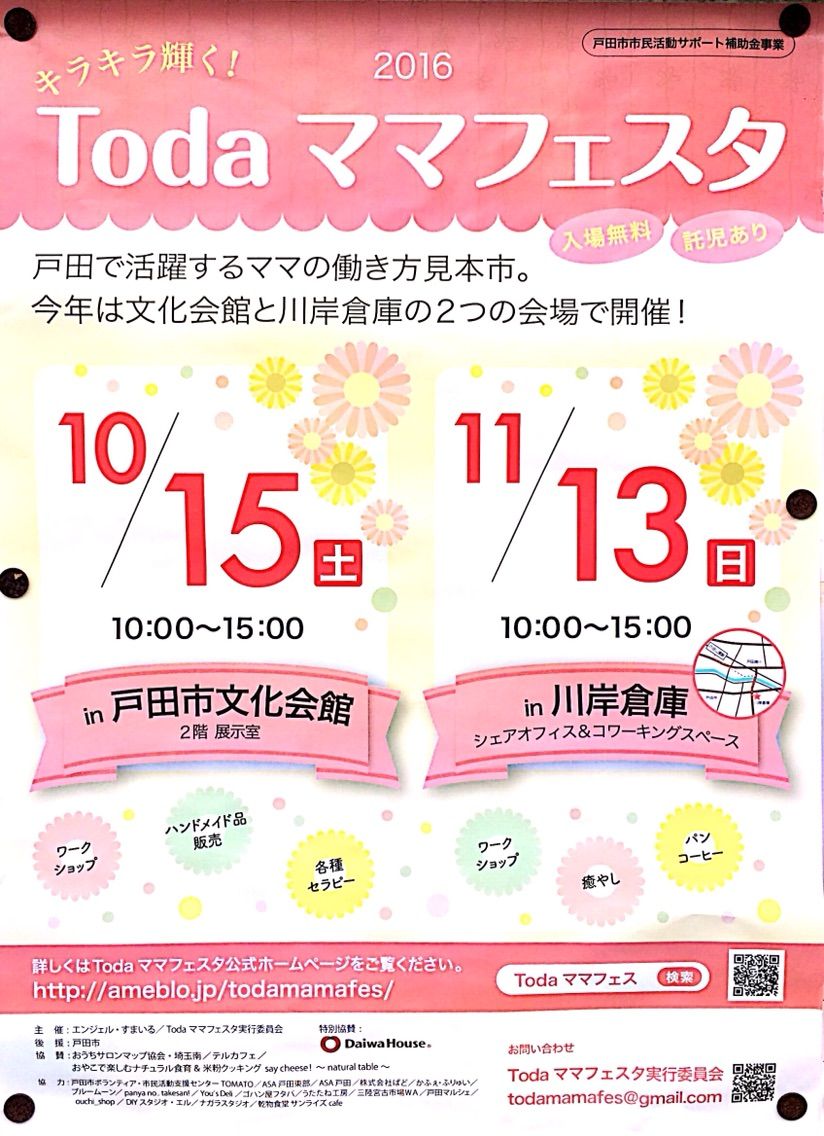 「キラキラ輝く! Toda ママフェスタ 2016」・・・戸田市の活気を創りだしているママさん元気。そんな行動力といきいきする姿を感じて、参加者も元気になれるママの働き方見本市です。