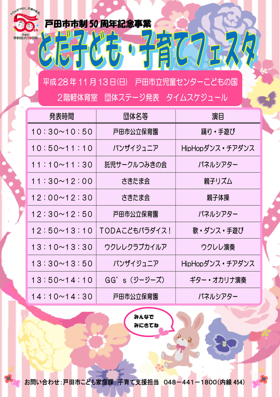 2016年11月11日 戸田こどもフェスタ 11月13日(日)戸田市立児童センターこどもの国で開催 <戸田市にお住まいの皆さまへ>このところ明後日13日に行われるイベントについてのお知らせが重なっていますが、今日ももうひとつご紹介します。戸田市市制施行50周年記念イベント「とだ子ども・子育てフェスタ」です。戸田市立児童センターこどもの国で開催される小さなお子様と親御様向けのイベントです。開催時間は10時から15時まで。団体さんのステージ発表もあります。詳しくはこの下にあるチラシをご覧ください。 「戸田市」カテゴリの最新記事 < 前の記事次の記事 > コメント コメントフォーム 名前 コメント 評価する リセット リセット 顔 星 投稿する 情報を記憶 トラックバック