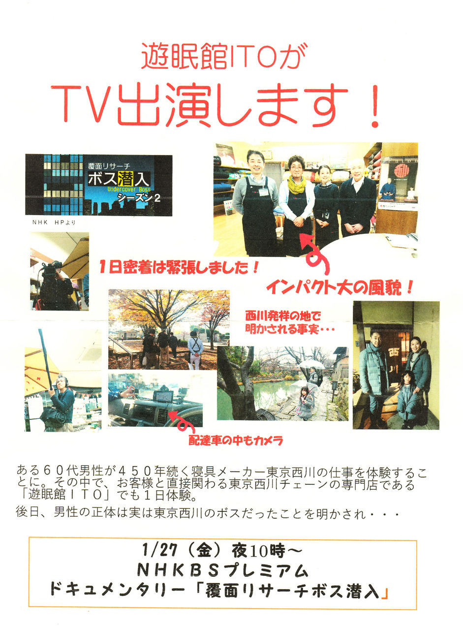 遊眠館ITOさんにお話を伺いましたが、NHKさんからは別の取材目的を告げられたそうです。そして、番組でどんなふうに紹介されるのか今もわからないとのこと!