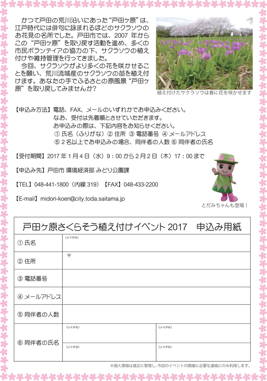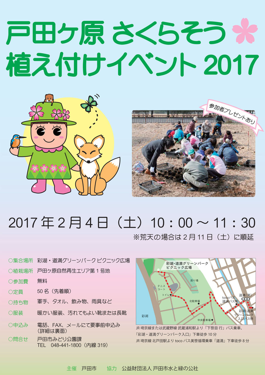 戸田市が自然再生に取り組む「戸田ヶ原自然再生エリア」で、戸田市の花に指定されている「さくら草」の植え付けイベントが行われます。