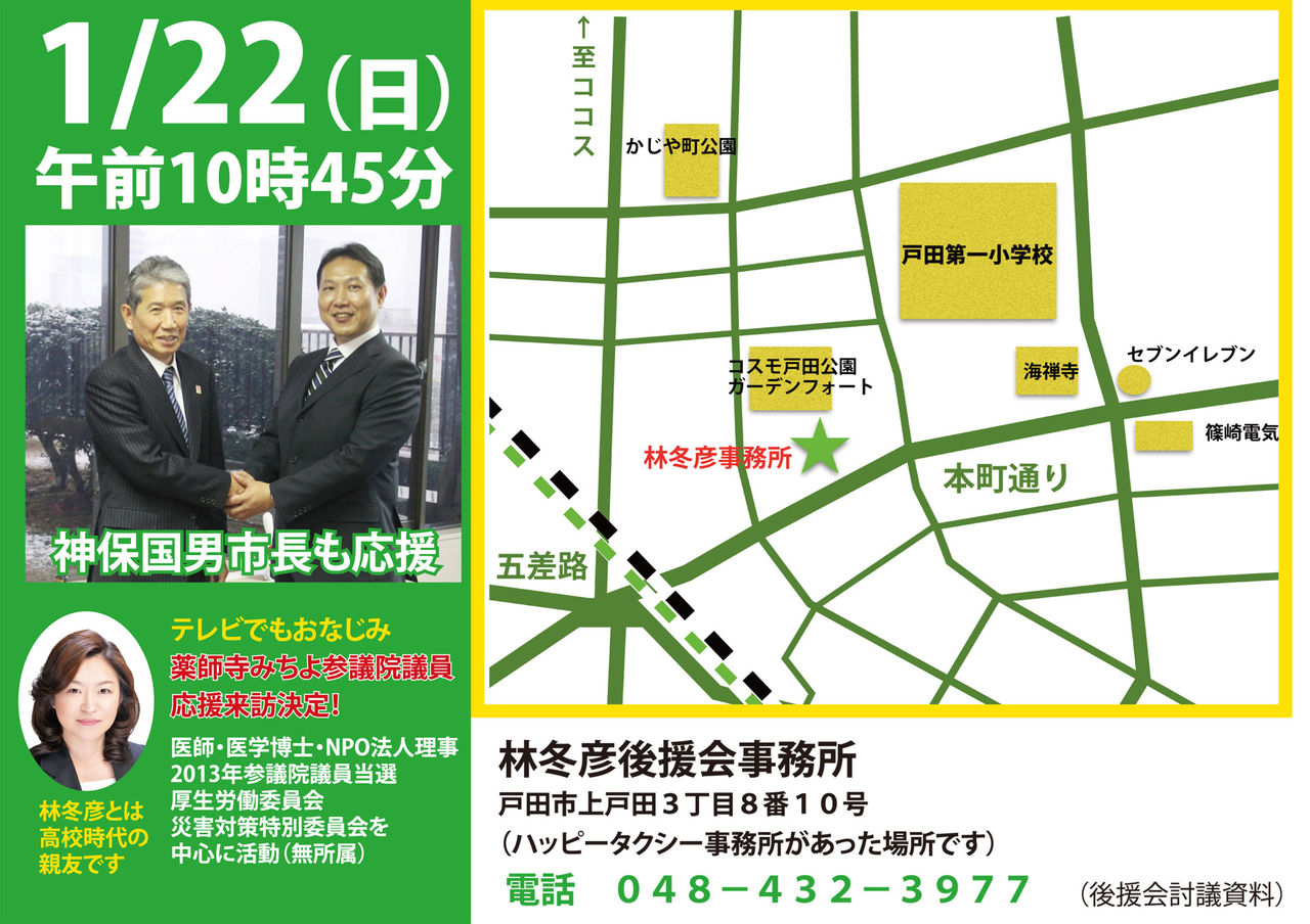 明日は、10時45分から、戸田市上戸田3丁目に設けた選挙事務所前で出陣式を行います。もしご都合つきましたら、ご声援を御願いいたします。それがとても励みになります。