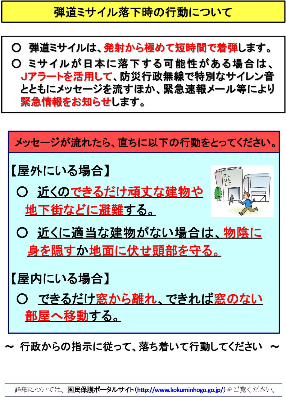 内閣官房国民保護ポータルサイトに「弾道ミサイル落下時の行動について」「弾道ミサイル落下時の行動Q&A」が21日追加されました。シェアさせてもらいます。北朝鮮が核実験あるいは弾道ミサイル発射実験をやった場合は、アメリカ軍も攻撃を開始し、その結果、不測の事態が起こる可能性もあります。ご注意ください。