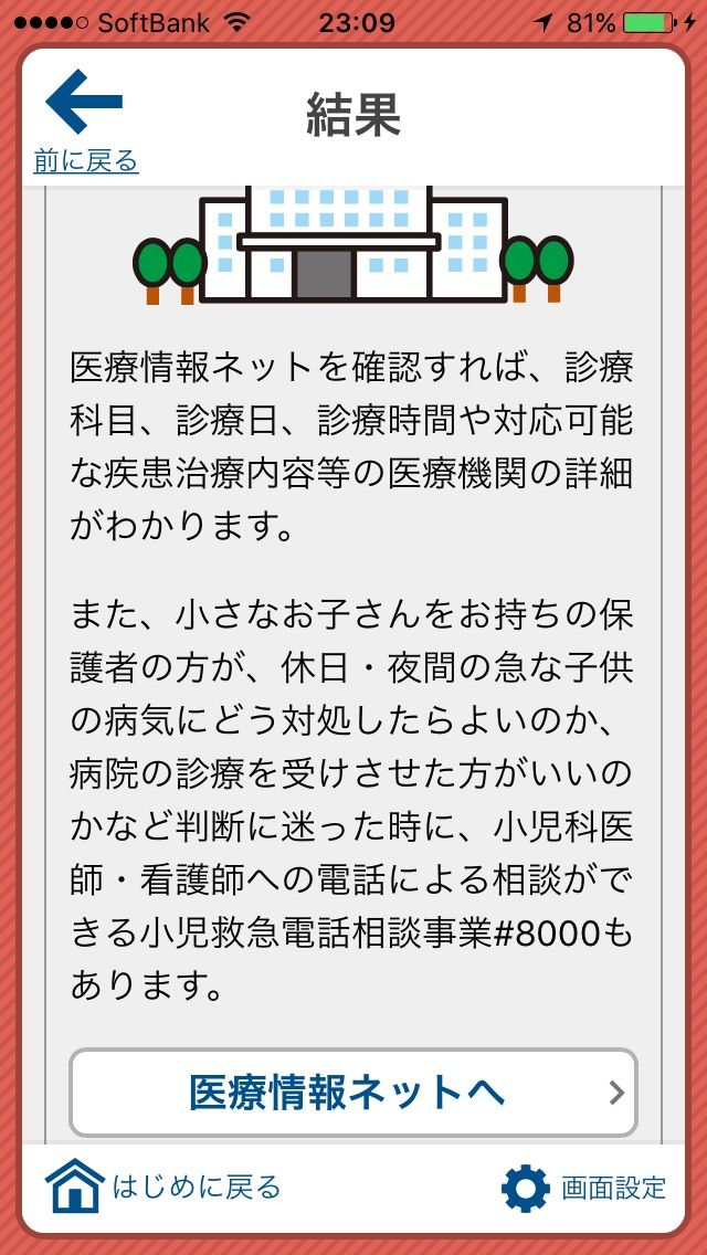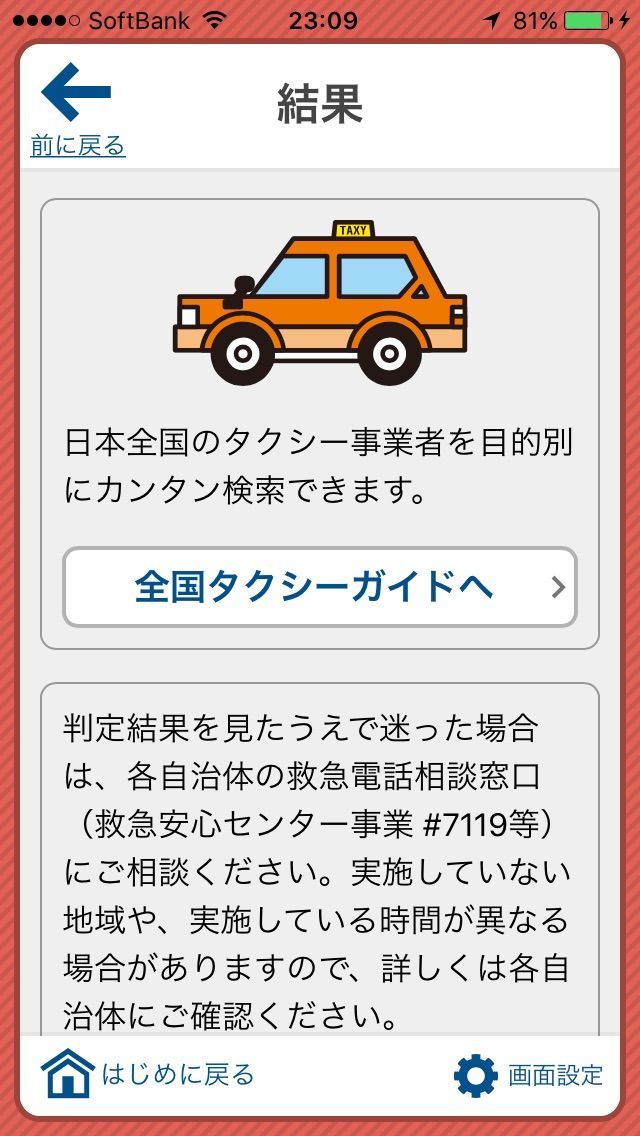 また、救急車の他、連絡先・相談先(医療ネット)の紹介や、タクシーを手配する「全国タクシーガイド」へのリンクも現れます。