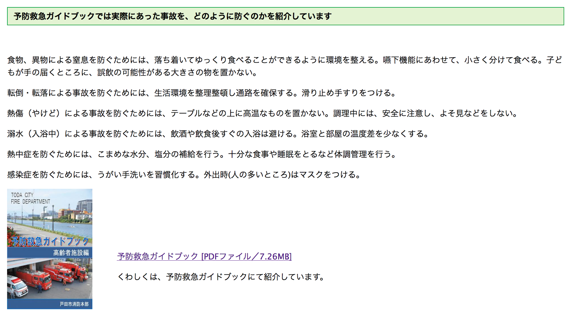 高齢者のおられる施設などを念頭に、大事に至らないための注意点や、いざというときの連絡先や応急処置などについて、実際にあった事故をもとに、とてもわかりやすくまとめられています。