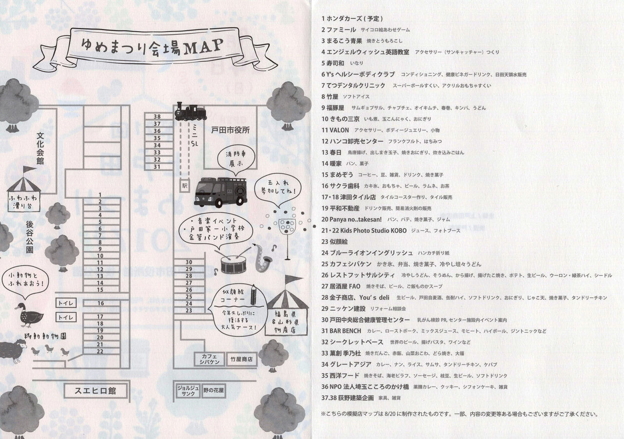 当日の会場マップもできました。上戸田商店会のお店や市役所などでお配りしています(この地図は8月20日時点のものです。変更などもありますのでご了承ください)。