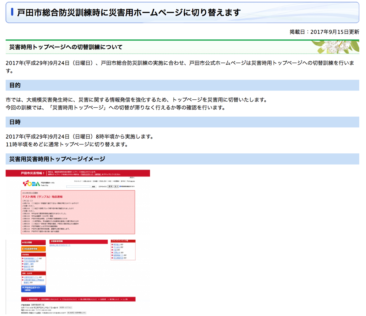また、万が一、地震ならば震度5強以上、風水害ならば避難準備情報や特別警報が発令された時に、戸田市のホームページは、災害用に切り替わりますが、この9月24日の防災訓練が行われている時間帯(8時半から11時半くらいまで)に、訓練の一環として戸田市のホームページが災害用に切り替わることになりました(切替中でも、通常ホームページを表示することはできます)。