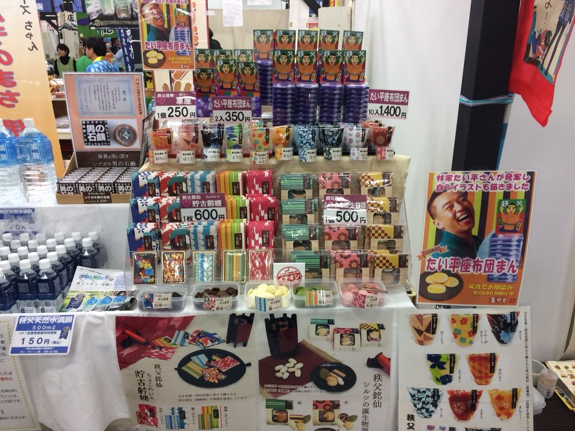 西武秩父駅で大人気のチョコ(埼玉県秩父郡皆野町の亀沢屋さん)も試食販売されています。秩父出身の林家たい平師匠が手がけたたい平座布団まんも人気です。笑点をイメージして座布団が10枚重なったお饅頭。縁起が良いですよ。