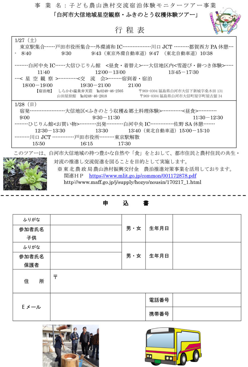 今回の「白河市大信地域星空観察&ふきのとう収穫ツアー」は、来年の1月27日・28日の一泊二日のツアーです。白河市に補助金が出ている関係で、戸田市からの参加料はバス・宿泊代・食事代込みでなんと4000円!。