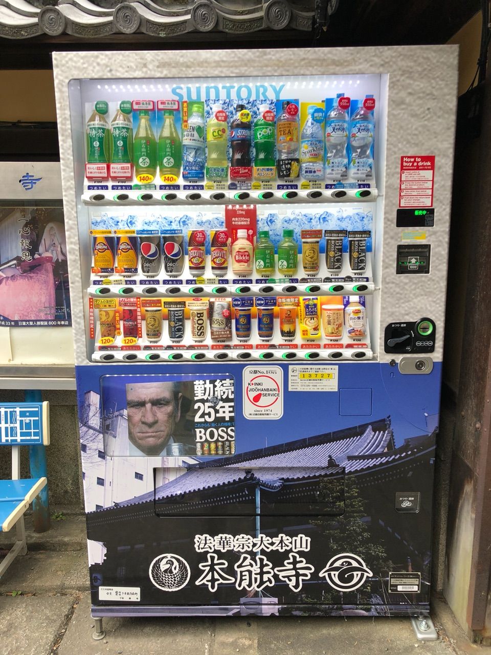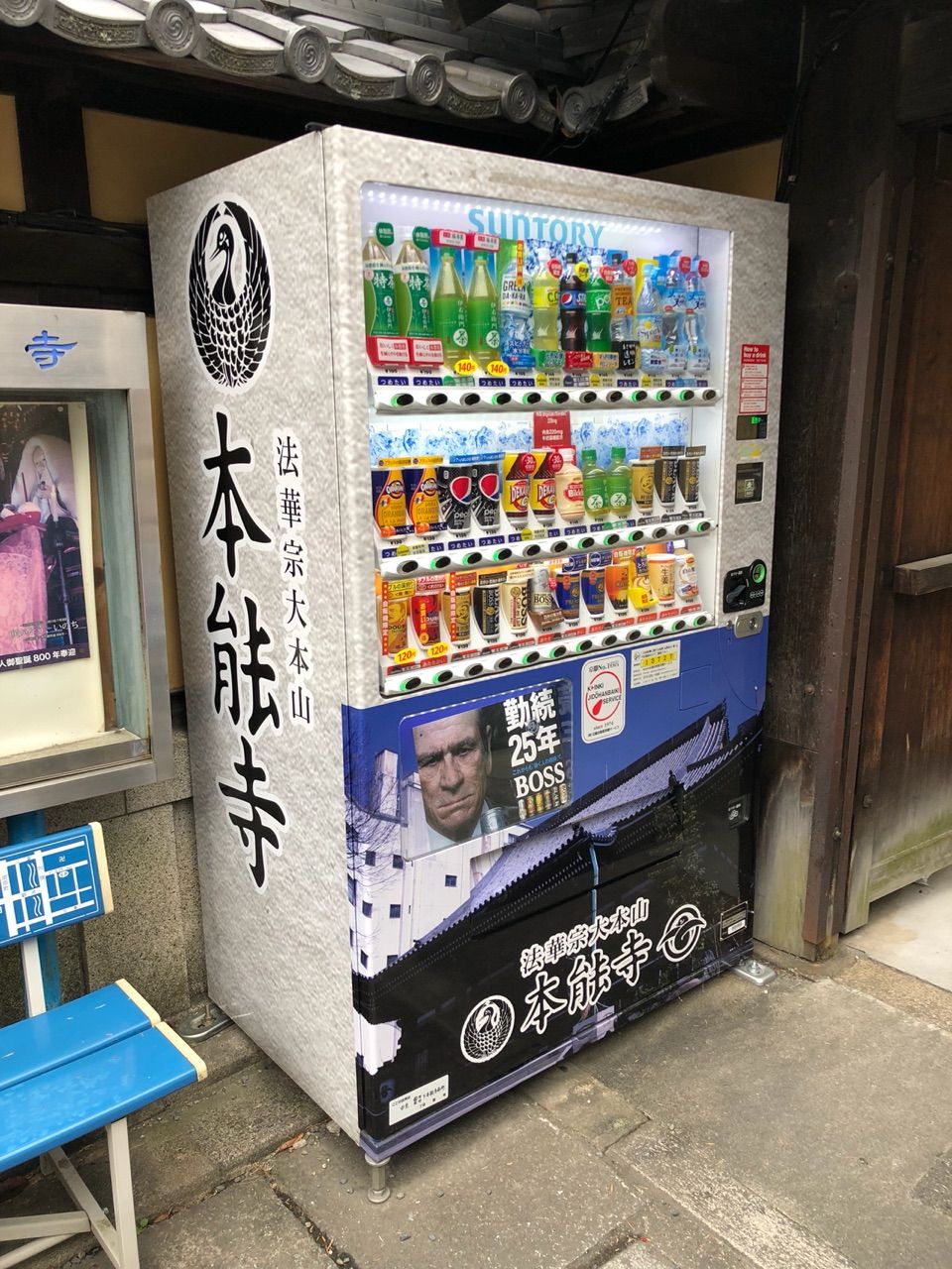 ところで、私はあちこちに行った際に変わった自販機ラッピングをみつけると写真に撮っていますが、この本能寺の自販機も本能寺ラッピングされていました。