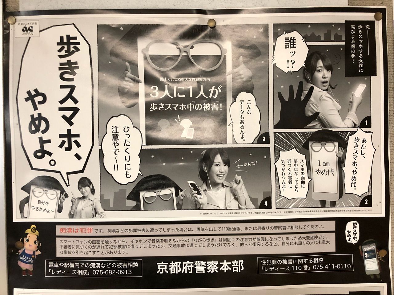 また、京都府警からのお知らせも貼られていました。スマホ歩きへの注意喚起です。