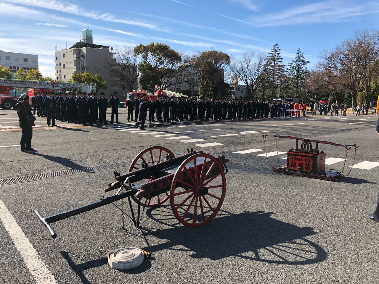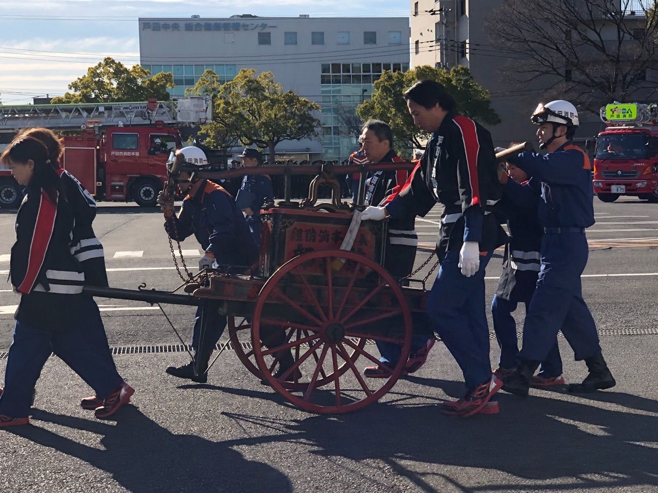 本日、快晴の空の下、午前9時半から戸田市役所駐車場を会場に行われた消防出初式。消防自動車や消防団や消防署隊員など行進、消防ヘリの旋回、梯子車からの降下訓練などが行われる中で、明治時代の手押式消防ポンプと現代の可搬ポンプの放水実演がありました。
