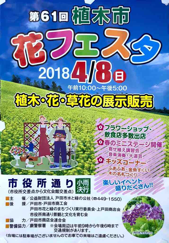 2018年03月01日 戸田市役所周辺が花の香りに包まれます!「戸田市第61回植木市・花フェスタ」4月8日(日)開催です! 今日から3月が始まりました。早朝は豪雨でしたが、それも9時頃にはあがり、日中はずいぶんと暖かくなりましたね。春のイベントといえば、戸田市花フェスタ。今年は4月8日(日)開催です。戸田市役所西側に隣接する市役所通りを歩行者天国にして、植木・花・草花の展示販売や、寄せ植え講習会、音楽演奏、大道芸などが行われます。詳しくはポスターをご覧ください。どうぞお楽しみに! 「戸田市」カテゴリの最新記事 < 前の記事次の記事 > コメント コメントフォーム 名前 コメント 評価する リセット リセット 顔 星 投稿する 情報を記憶