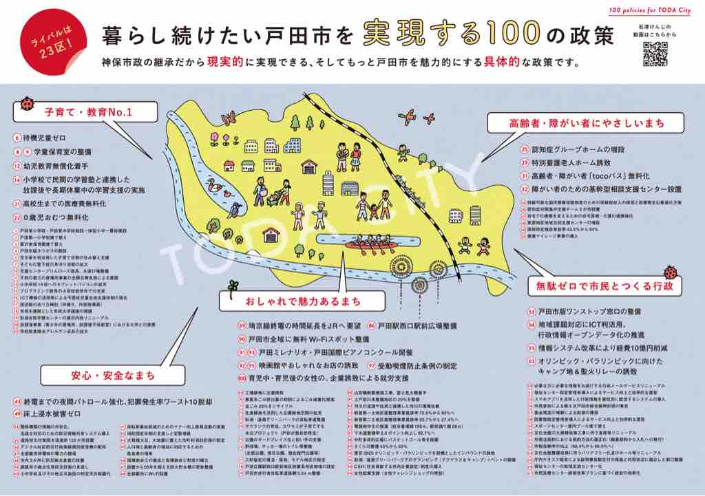 戸田市副市長として市政を担ってきた経験をもとに、10年先を考えて戸田市が取り組まなければならない課題を抽出。財源の裏付けも手当てし、4年間で実現できる政策となっています。石津けんじさんが副市長時代に着手し、実際に戸田市で進められているものもあります。