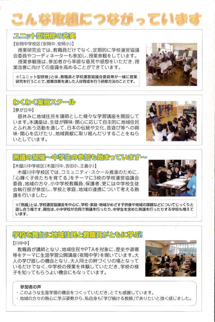 また、学校間の「連携」を重視し、具体的に活動していることも特徴的でした。たとえば、学校毎に設けられている学校運営協議会を連携する学校で合同開催したり、校長先生方が定期的な連絡会をもっていたり、連携する小学校の児童達がそれぞれ交流する場づくりをしたり、中学校で行われる立志式に連携する小学校の児童が参加したり、などです。