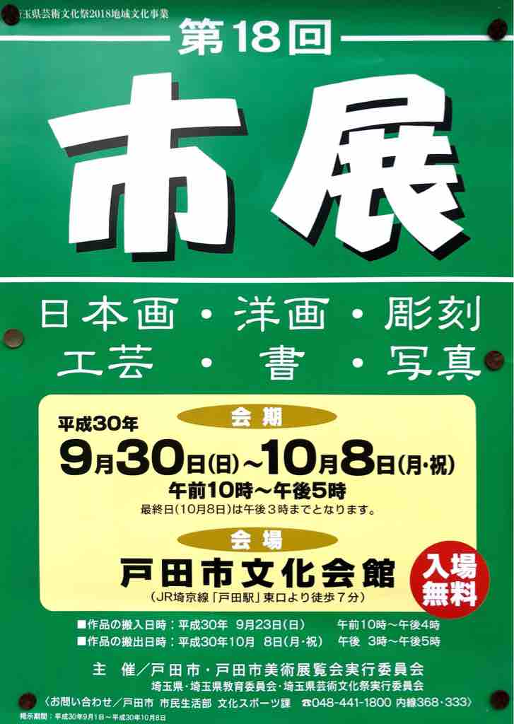 2018年09月14日 戸田市秋の芸術祭典「市展」9月30日から10月8日戸田市文化会館にて開催です! 芸術を愛する戸田市民が多く参加する「市展」、今年も芸術の秋に開催です。9月30日(日曜日)から10月8日までの(月曜・祝日)までの9日間、午前10時から午後5時まで戸田市文化会館を使っての開催です。昨年も私は行きましたが、出展されている絵画や彫刻、書道、写真、工芸品に見とれてしまいました。今年も行きます!初日の9月30日は戸田市文化会館前で、上戸田商店会さんが主催される上戸田ゆめまつりが午前10時から午後4時まで開催されています。初日でしたら、あわせてお楽しみください。 「戸田市」カテゴリの最新記事 < 前の記事次の記事 > コメント コメントフォーム 名前 コメント 評価する リセット リセット 顔 星 投稿する 情報を記憶
