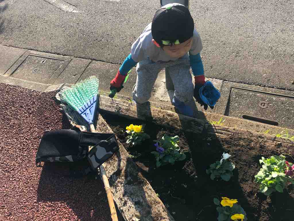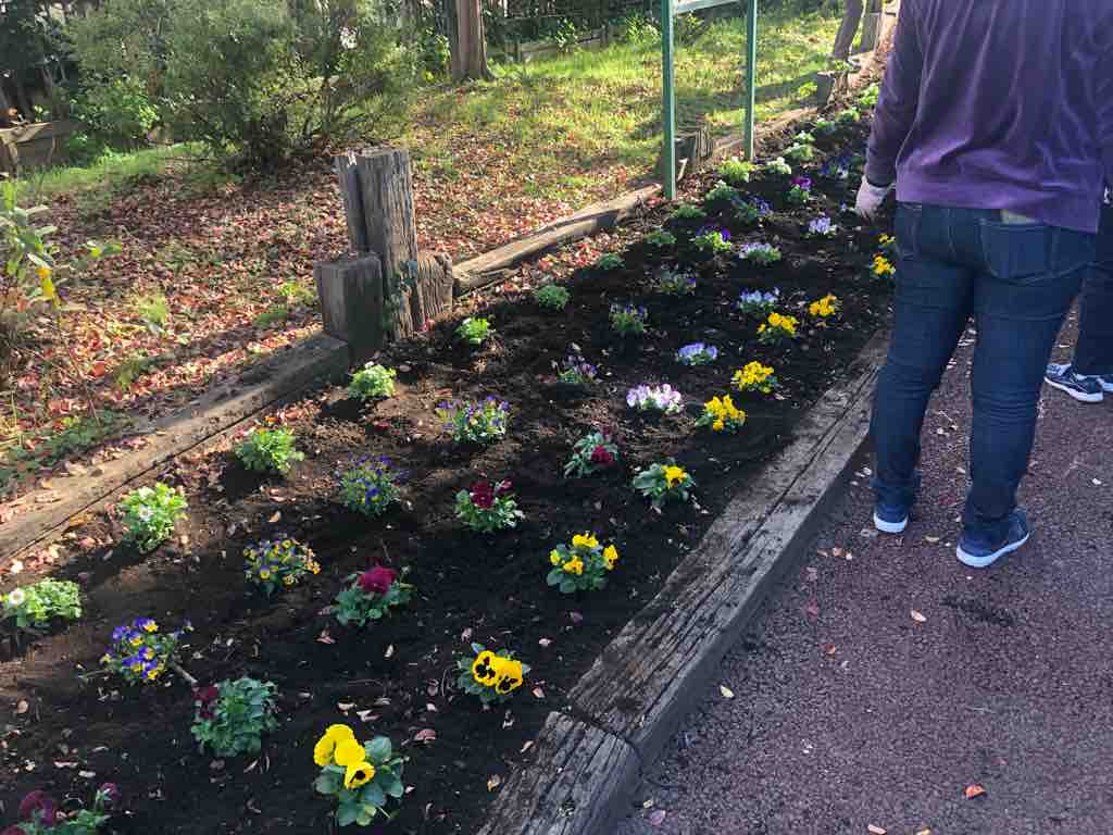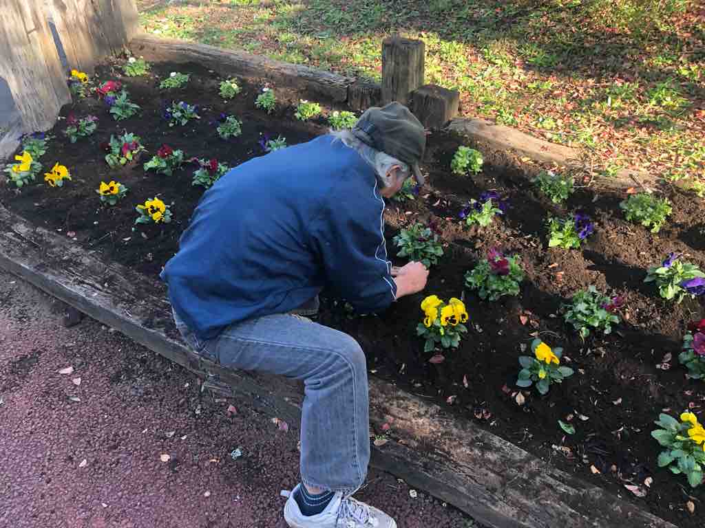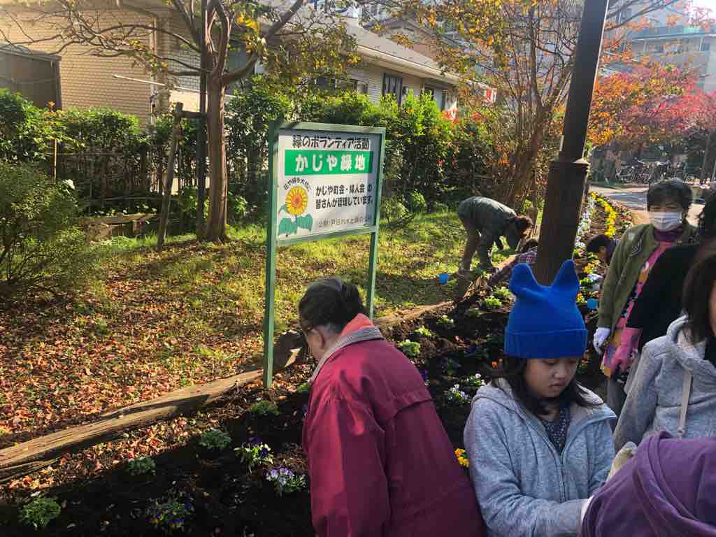 年二回の花の植え替え、そして定期的な花の水やりは鍛冶谷(かじや)町会が担当しています。今日の植え替えには、地域の民間学童の先生や子どもたちも参加してくれました。