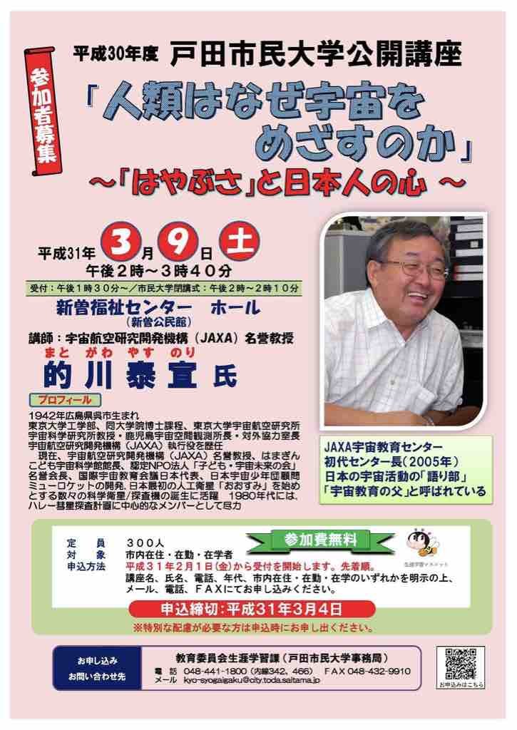 あの映画のモデルにもなったJAXA初代センター長・的川泰宣氏を講演者に迎えた公開講座が3月9日土曜日に新曽福祉センターで開催されます。