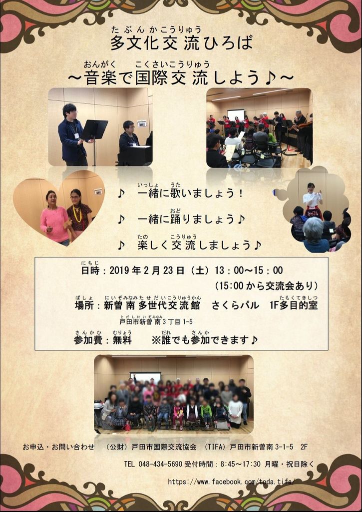 戸田市国際交流協会が主催する、ハワイアン、ジャズ、和太鼓から、アフリカやメキシコのダンスや歌まで、様々な国の様々なジャンルの音楽・歌・ダンスを通じた国際交流。参加費無料です。