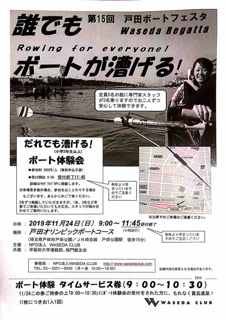 その戸田ボートコースを使って、戸田市主催の市民ボート教室もありますが、今回ご紹介するのはNPO法人WASEDA CLUBさんが主催されるレガッタボート体験会(早稲田大学漕艇部・稲門艇友会共催)。