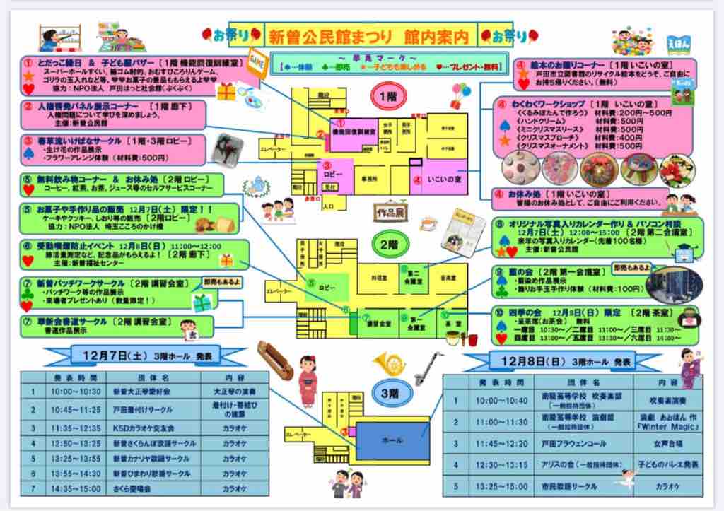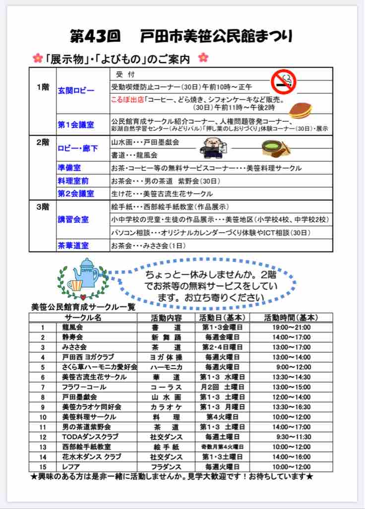 各サークルの活動発表・展示、お茶会、南稜高校生徒による発表、子ども向けゲームコーナー・子ども服バザー、子ども向けワークショップ、市内福祉団体による食料品の販売、パソコン相談(オリジナルカレンダー作り体験)など