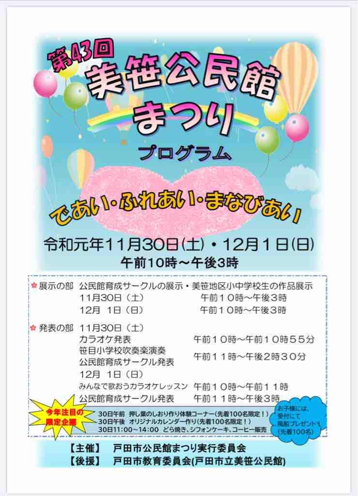 「であい、ふれあい、まなびあい」をテーマとする公民館まつり、お近くでの開催があればどうぞ覗いていてください。