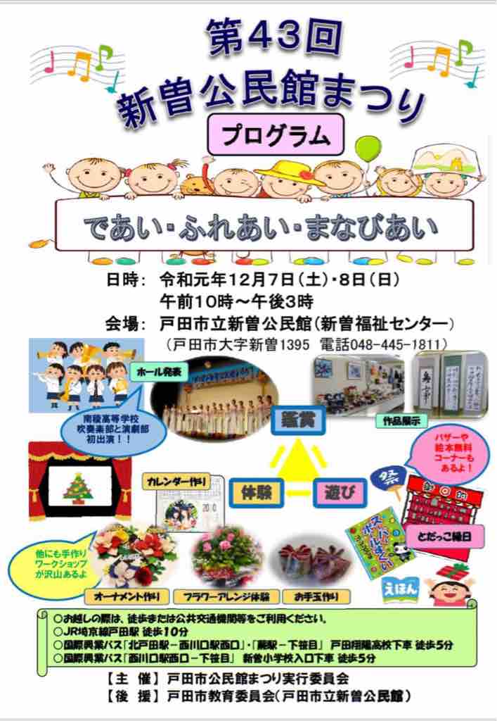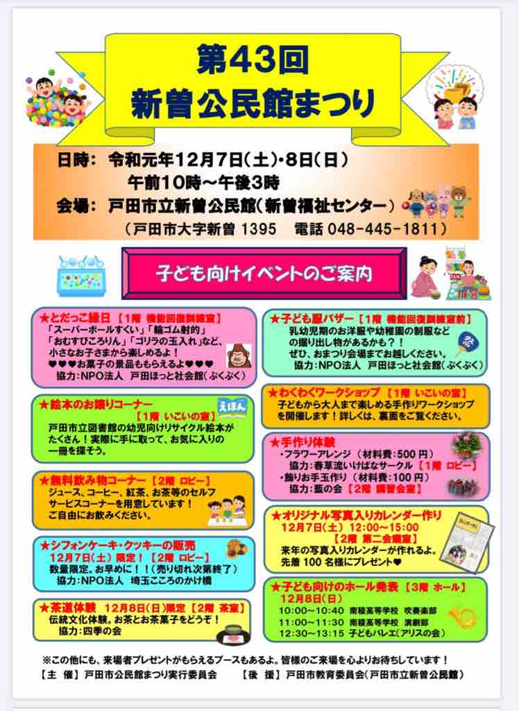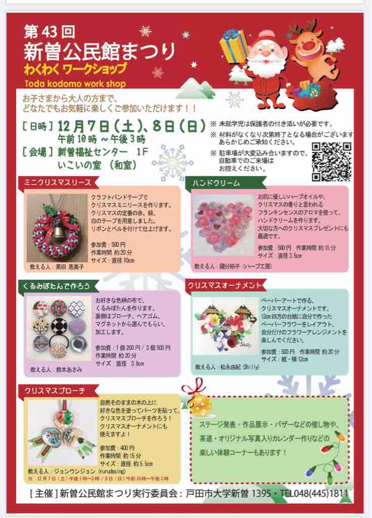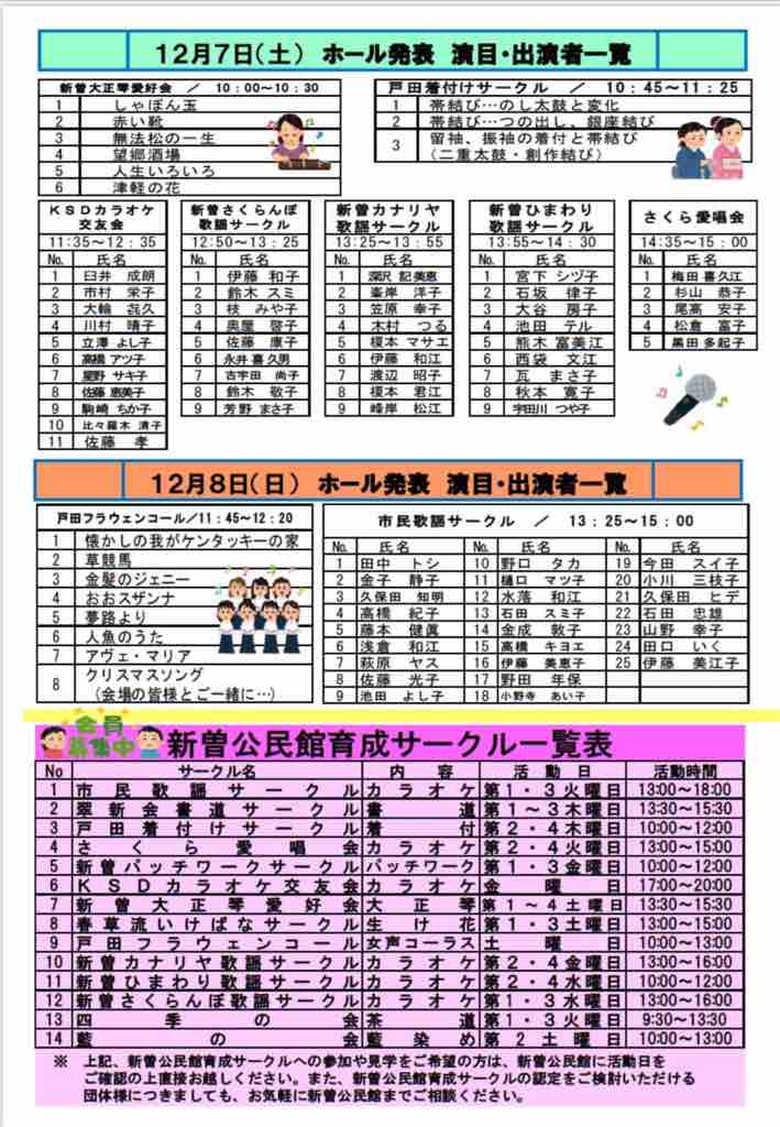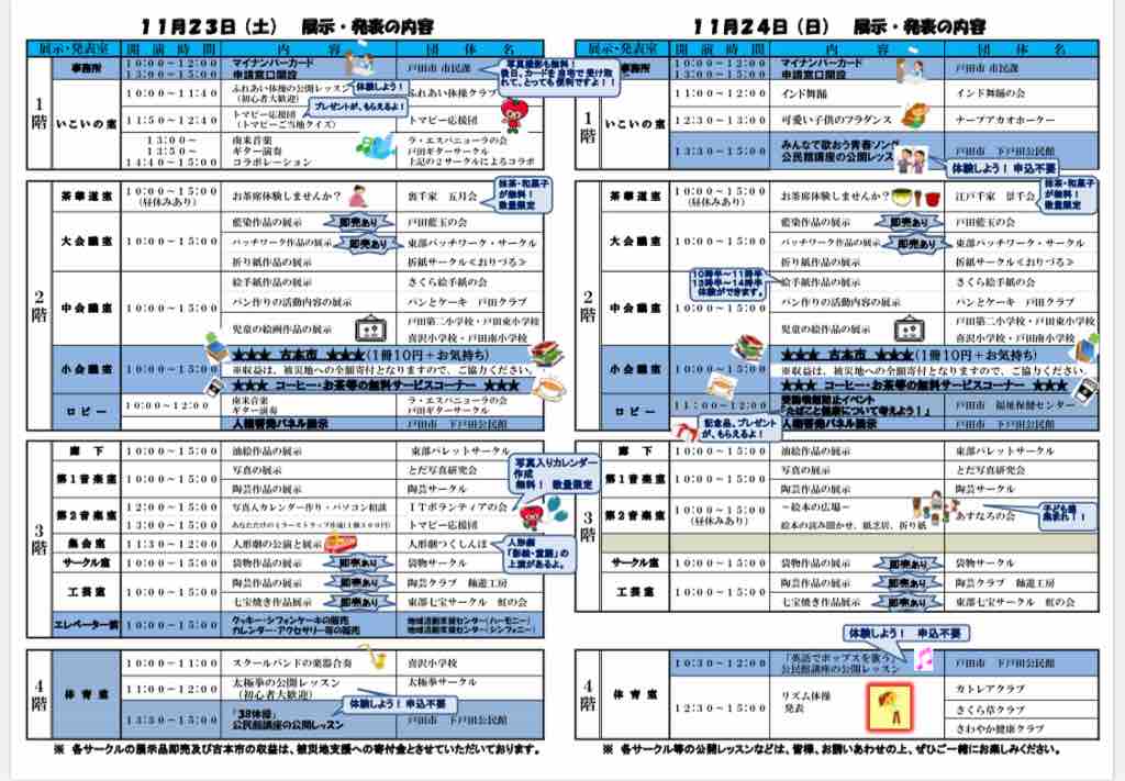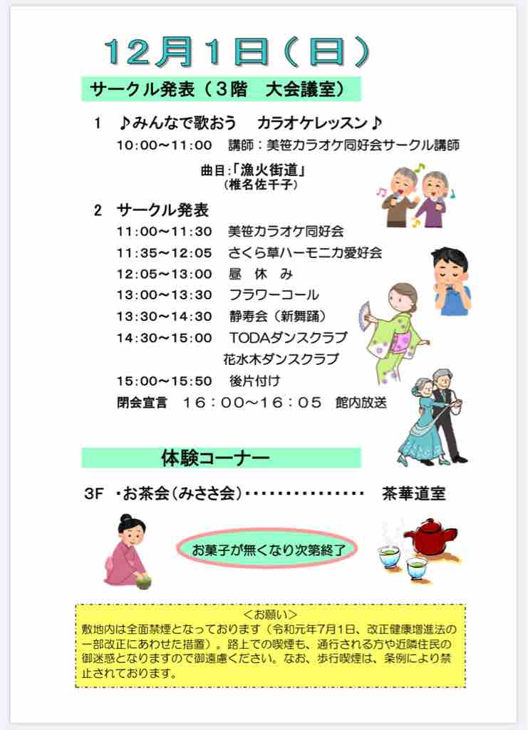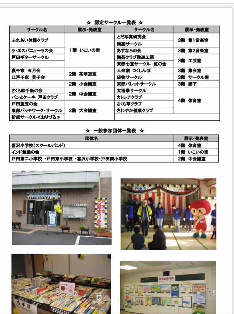 各サークルの活動発表・展示、お茶会、地域の小・中学校の作品展示、笹目小学校金管バンドの発表、彩湖自然学習センターによる押し葉しおり作り体験、市内福祉団体による食料品の販売、パソコン相談(オリジナルカレンダー作り体験)など