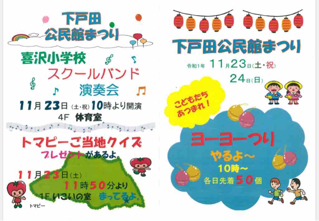 各サークルの活動発表・展示、お茶会、人形劇、各種スポーツサークルの体験、地域の小学校の作品展示・喜沢小学校スクールバンドの発表、古本市、市内福祉団体による食料品の販売、パソコン相談(オリジナルカレンダー作り体験)、マイナンバーカード申請特設窓口など