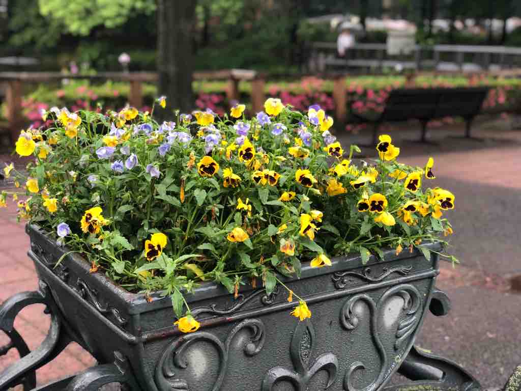 (写真は戸田市役所正門前。後谷公園の池の前の道に飾られているフラワースタンドです)