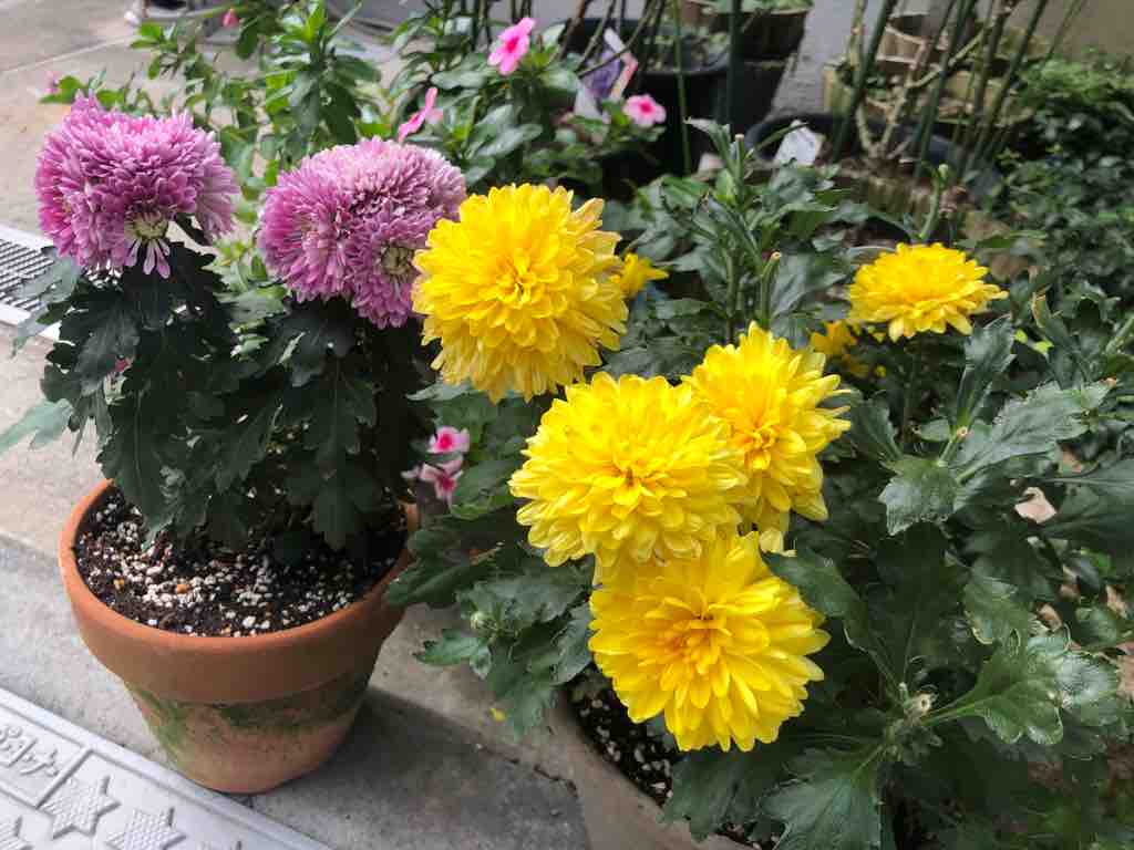 (写真は、ご近所さんが軒先で育てられている「ピンポン菊(ピンポンマム)」です)