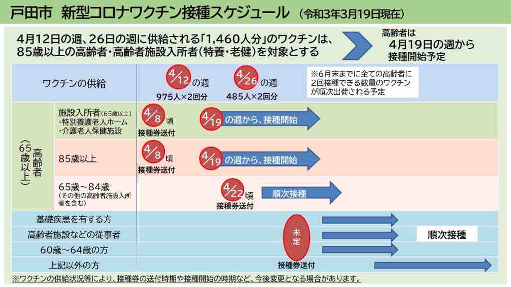国の方針では、6月末までに、戸田市に住む65歳以上の高齢者が2度接種できる数量のワクチンが戸田市に配布される予定となっています。