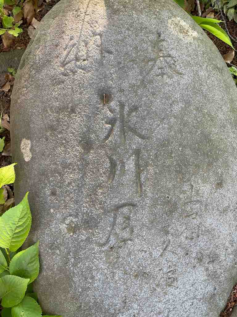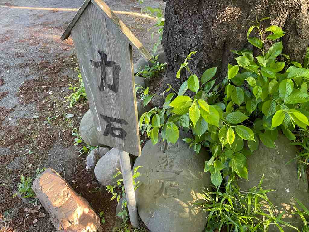 その昔、力自慢が競い合った力比べに用いられた「力石」、よく見ると名前や「奉納五貫目」「奉納氷川石」といった文字が刻まれています。