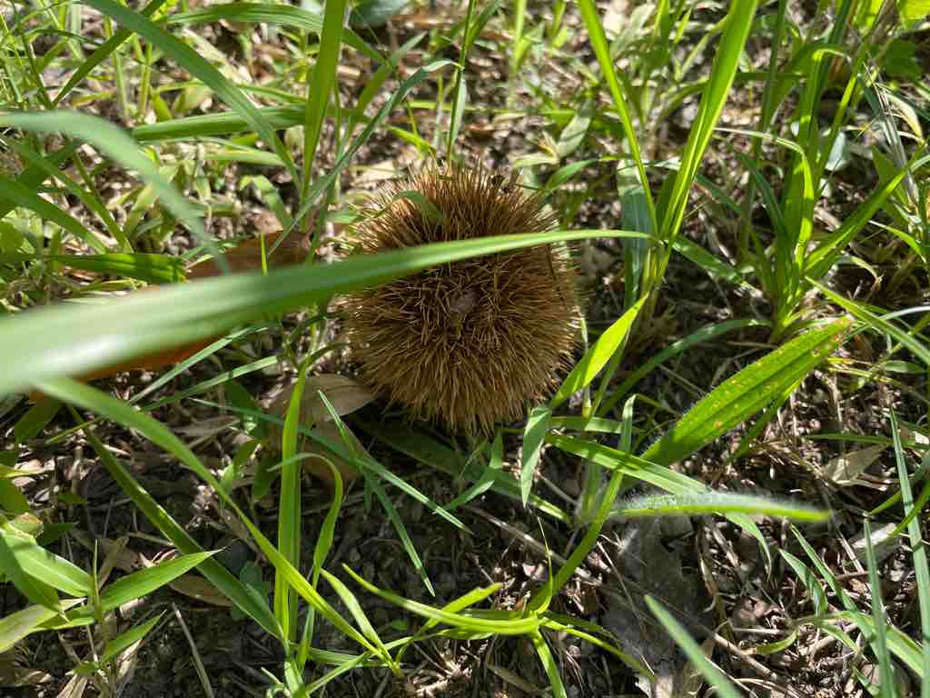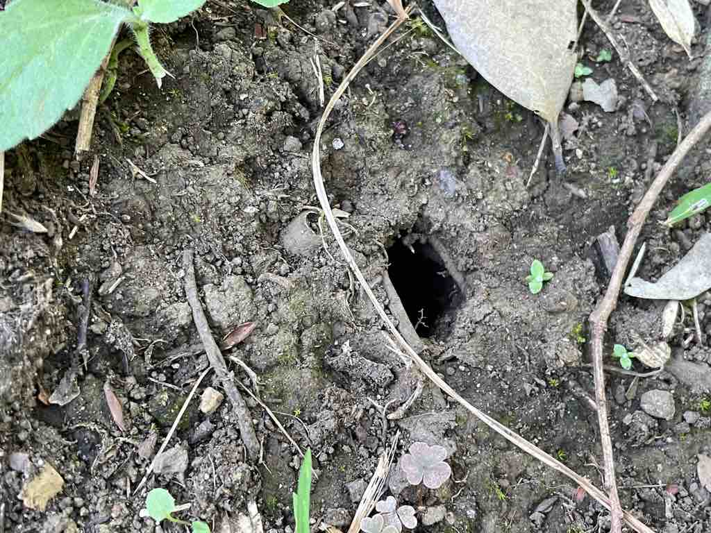 写真はゴミ拾いの時にみつけた蝉の幼虫が出てきた穴。たくさんありました。また、さすがどんぐり公園、いが栗がまだ落ちていました。
