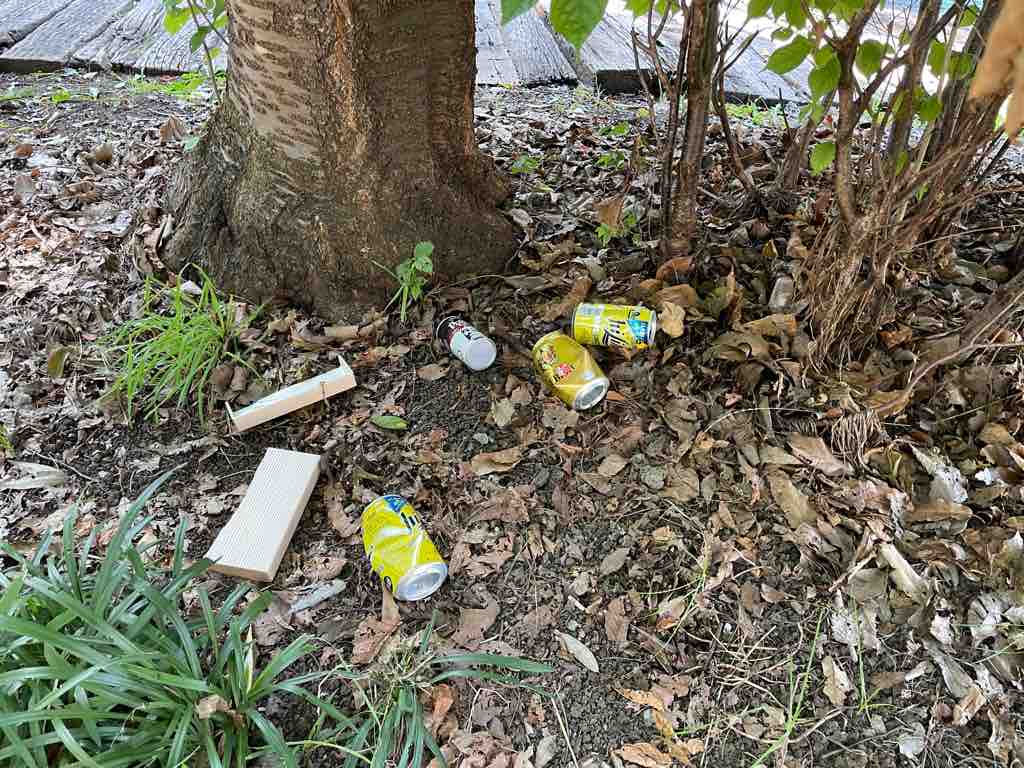 ベンチで酒飲みするなとはいいませんが、ゴミは持ち帰りいただきたく思います。これが常態化するとベンチの使用禁止にもつながりかねません。