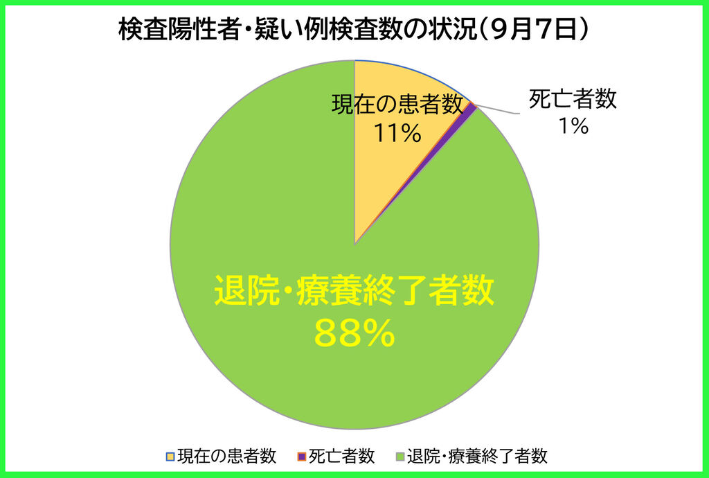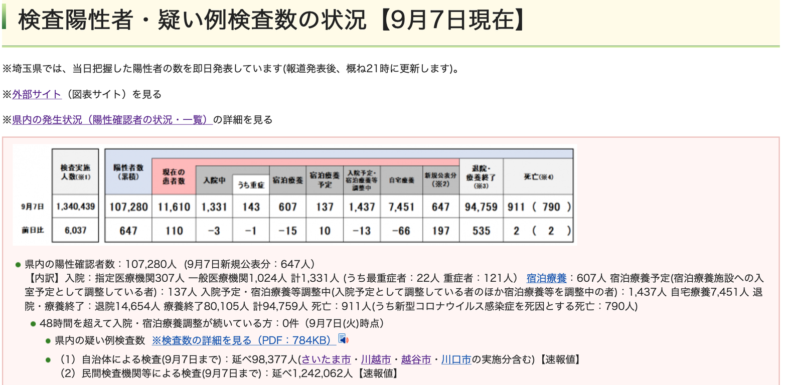 9月7日(火)、埼玉県の現在の患者数は、前日より「110人増加」の計11610人。535人の方が、退院・療養終了されました(新たな陽性者は647人)。