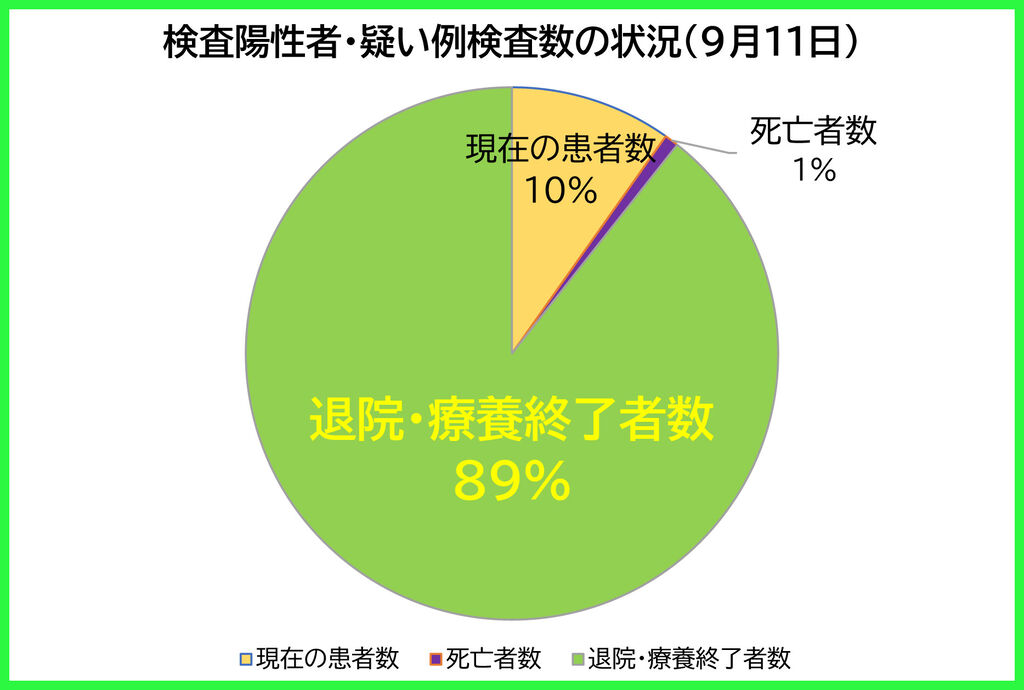 9月11日(土)、埼玉県の現在の患者数は、前日より「150人【減少】」の計10792人。924人の方が、退院・療養終了されました(新たな陽性者は780人)。