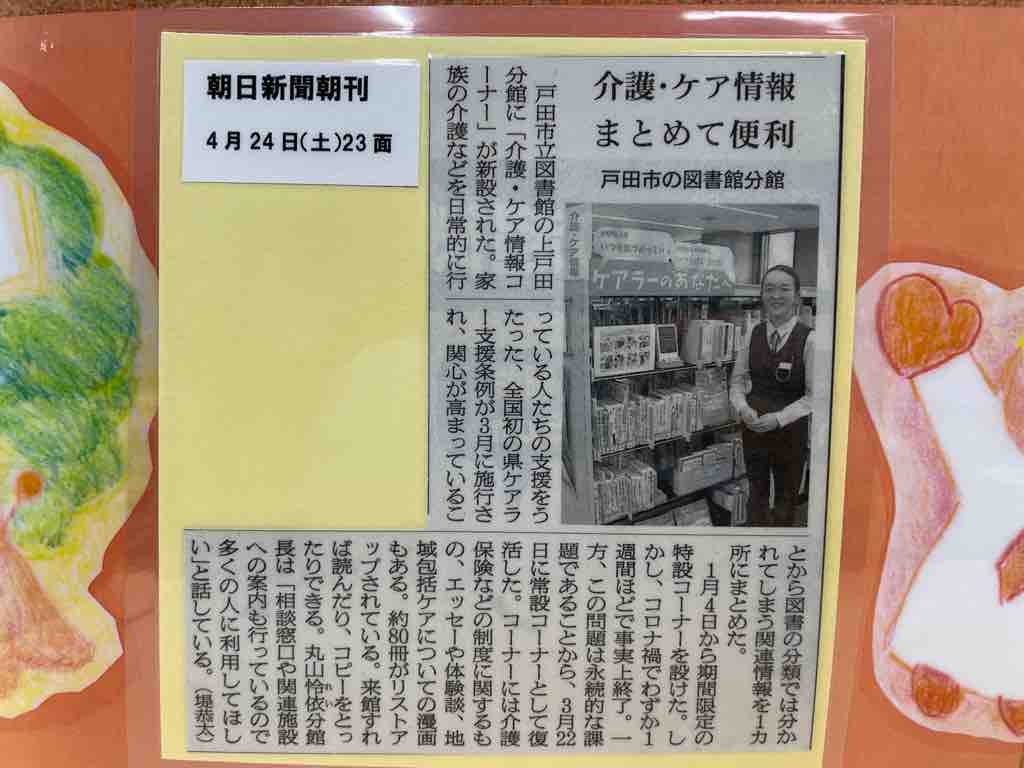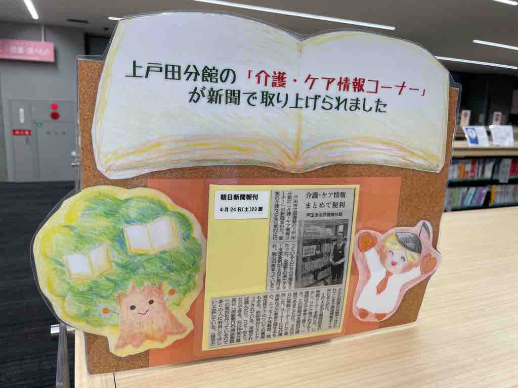 その際、答弁に立たれた教育部長から紹介いただいたのが、上戸田地域交流センターあいパル2階にある図書館上戸田分館に設置されている「介護・ケア情報コーナー」でした。
